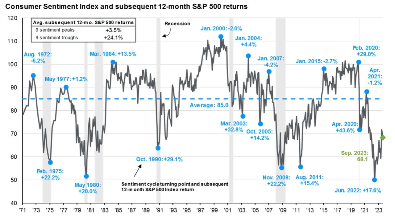 Let's get a bit technical for a minute and look at the correlation between stock market performance (the percentage returns in bright blue below) and consumer sentiment, which is an economic indicator that measures how people are feeling about their finances and the state of the economy. This is a chart JP Morgan publishes regularly and I think it's great for demonstrating that how we feel is not very good at predicting how the stock market will do.